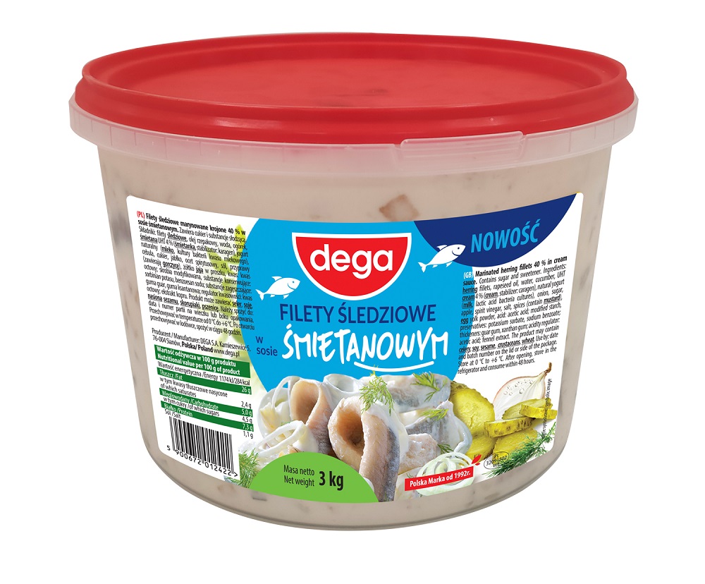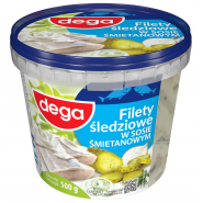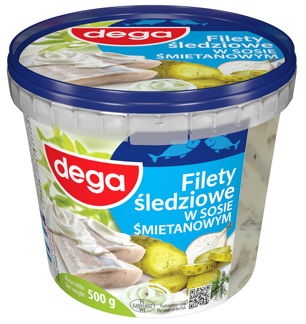 Wysoka zawartość filetów ze śledzia marynowanego wysokiej jakości w aromatycznej i kremowej śmietanie! Aksamitny śmietanowy sos z cebulką i jabłkiem doskonale przełamuje kwaśność śledzika i wyrazisty smak ogórka z nutą aromatycznych przypraw . Unikatowa receptura DEGA gwarantująca smak. Tradycja w nowoczesnym wydaniu !