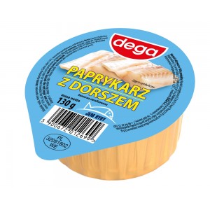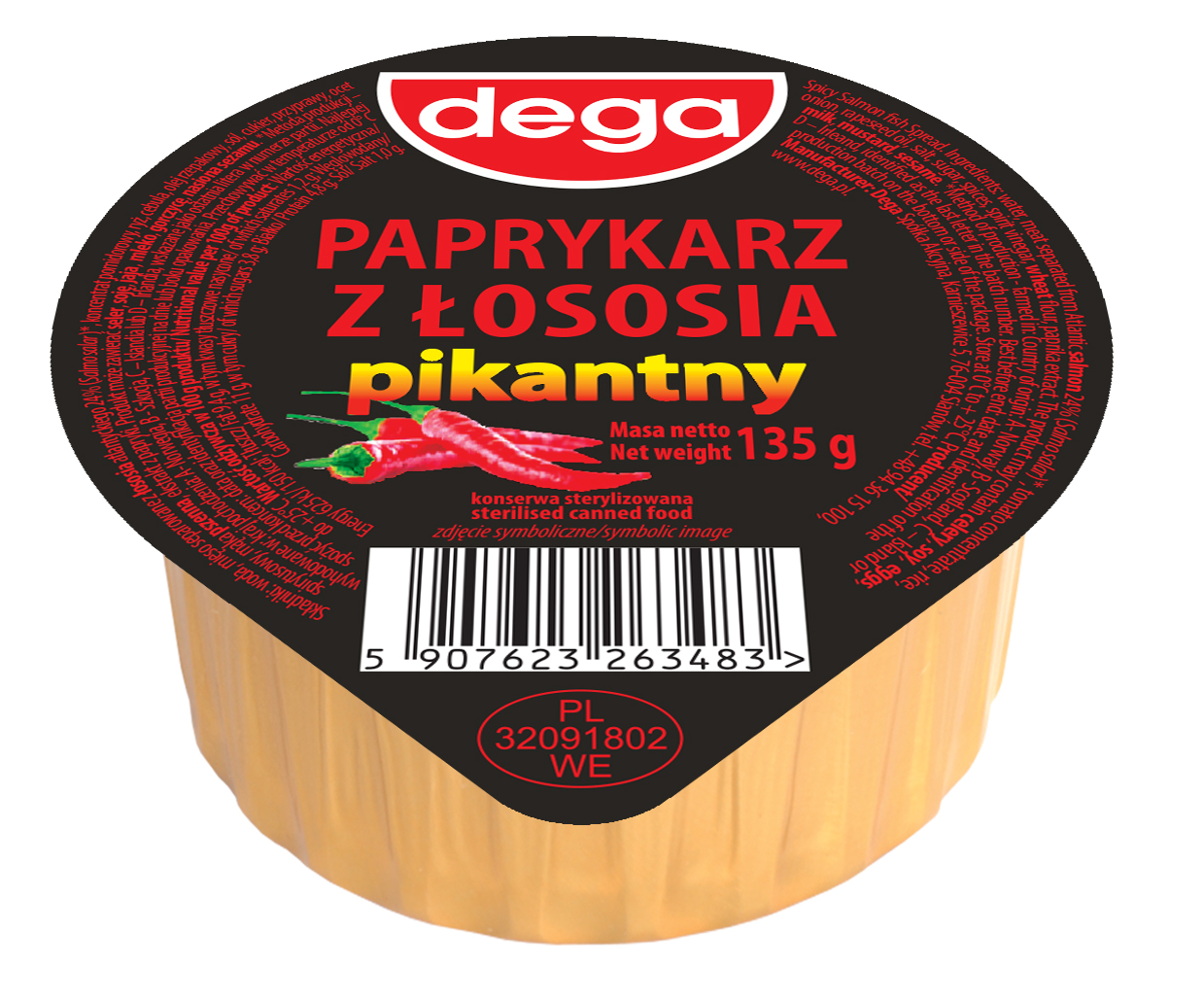 Paprykarz na bazie mięsa z łososia (26%), ryżu i koncentratu pomidorowego, cebulki, pikantnych przypraw. Produkt sterylizowany. Może zawierać seler, soję, jaja, mleko, gorczycę.