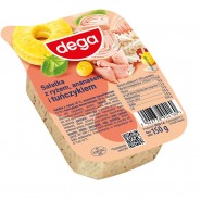 Nowość w ofercie Dega. Wysokiej jakości gotowany biały ryż to doskonała baza sałatki i świetnie się sprawdza w połączeniu z wysokiej jakości tuńczykiem. Słodki ananas i kukurydza doskonale łączą się z rybką i ryżem. Sałatka pasuje jako samodzielny posiłek ale również jako dodatek do nachos i grissini. Unikatowa receptura Dega.